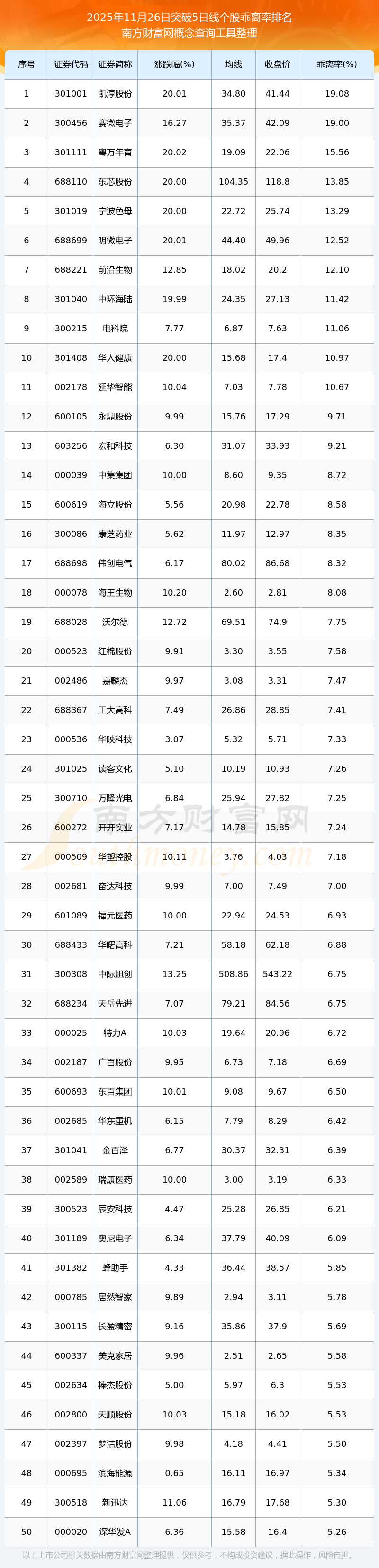 根據(jù)南方財富網(wǎng)概念查詢工具數(shù)據(jù)統(tǒng)計,截止2025年11月26日收盤,共有267只個股收盤價向上突破了5日線,其中乖離率較大的個股有凱淳股份、賽微電子、粵萬年青、東芯股份、寧波色母等,乖離率分別為19.08%、19.00%、15.56%、13.85%、13.29%。