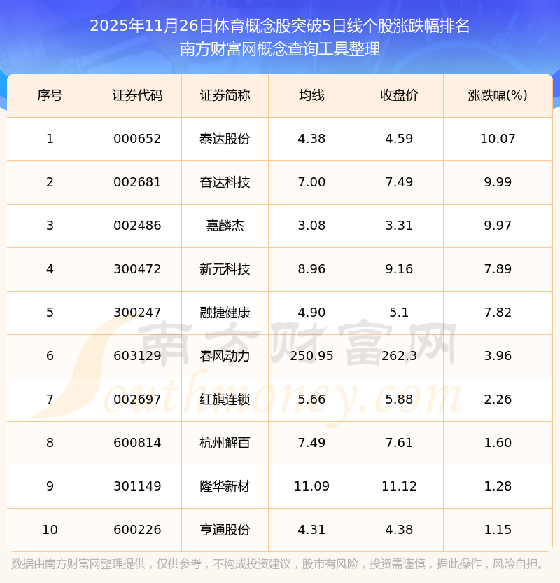 2025年11月26日體育概念股突破5日線(xiàn)個(gè)股漲跌幅排名