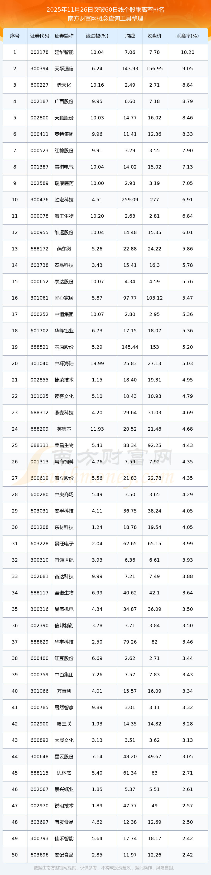 2025年11月26日突破60日線個(gè)股乖離率排名