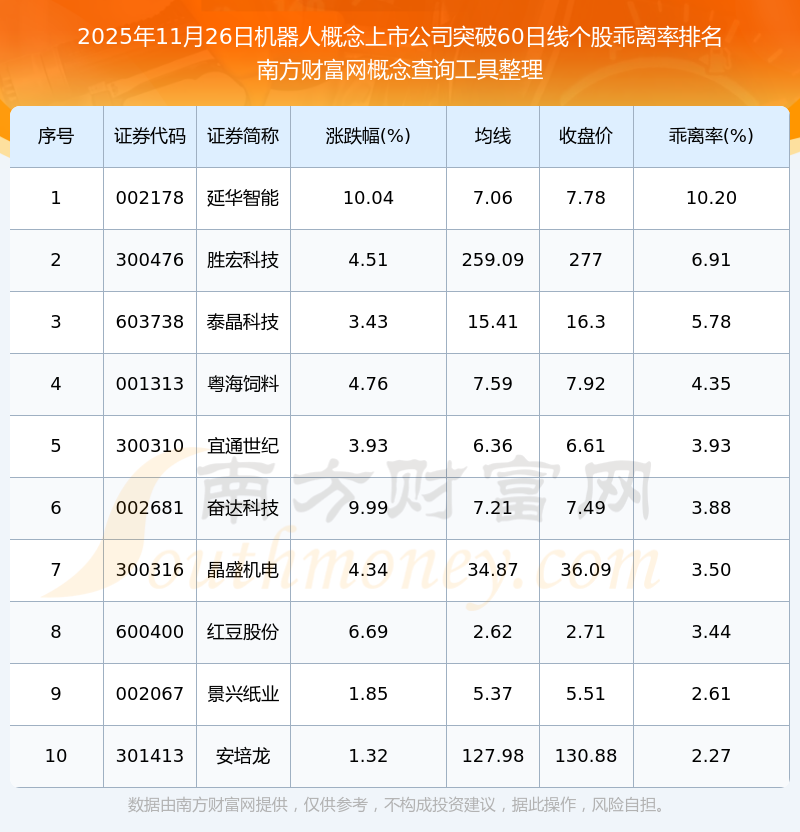 2025年11月26日機(jī)器人概念上市公司突破60日線個(gè)股乖離率排名