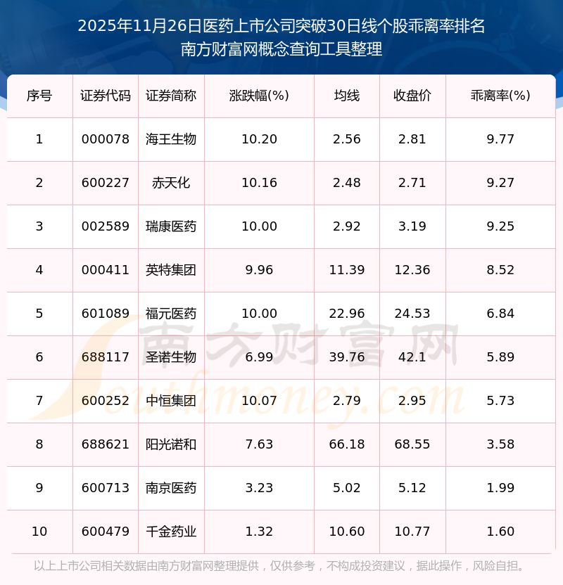 2025年11月26日醫(yī)藥上市公司突破30日線個股乖離率排名