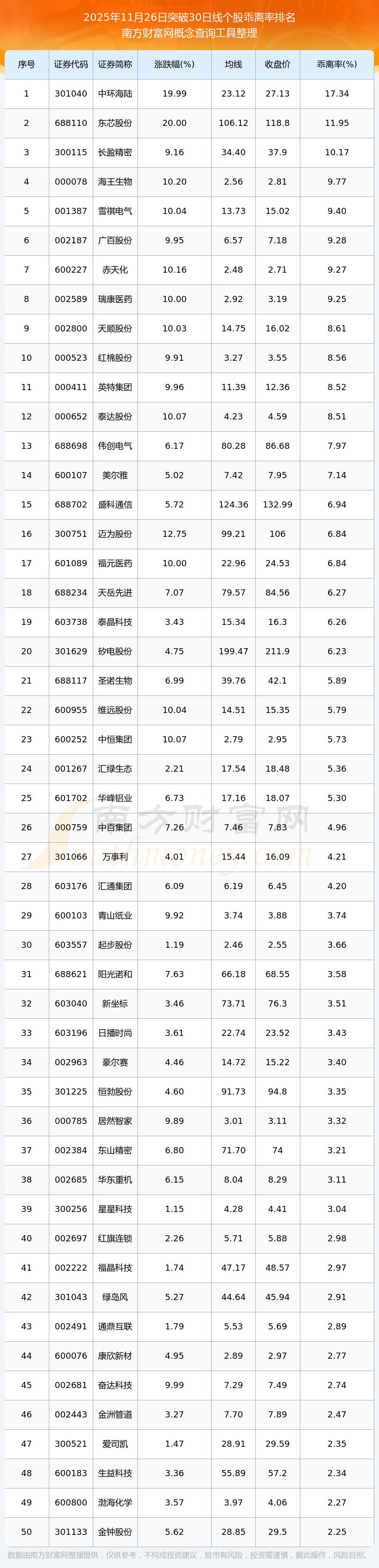 2025年11月26日突破30日線個(gè)股乖離率排名