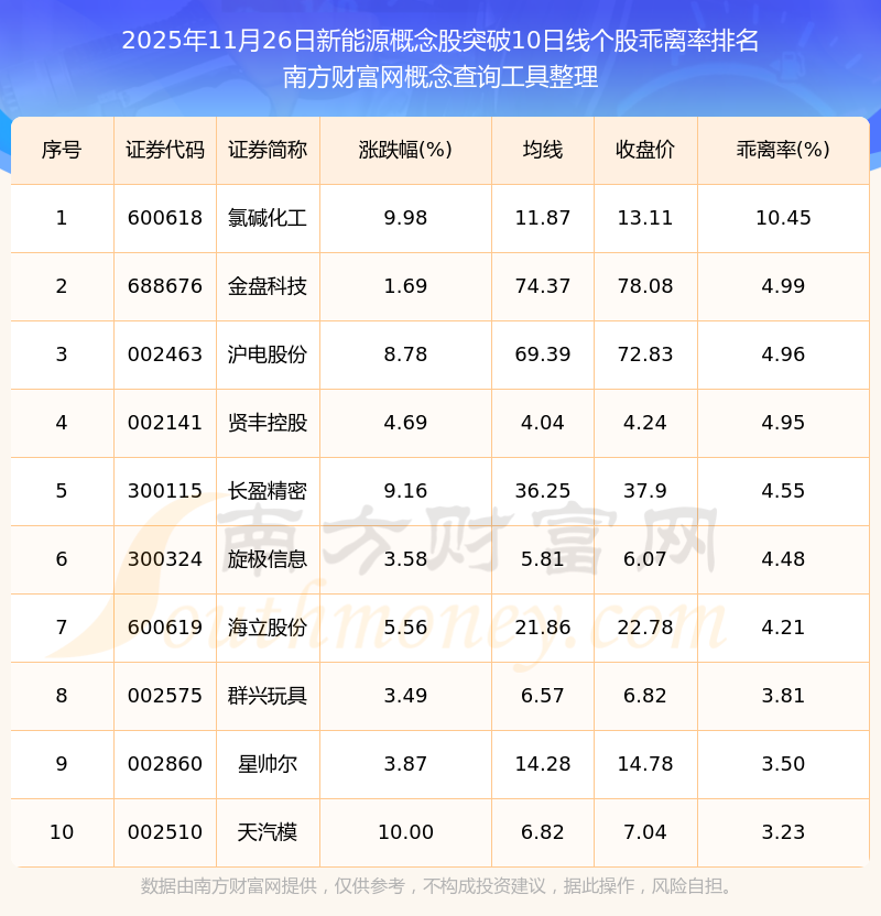 根據(jù)南方財(cái)富網(wǎng)概念查詢工具數(shù)據(jù)統(tǒng)計(jì),截止2025年11月26日收盤,新能源概念股共有25只個(gè)股收盤價(jià)向上突破了10日線。其中乖離率較大的個(gè)股有氯堿化工、金盤科技、滬電股份等,乖離率分別為10.45%、4.99%、4.96%。