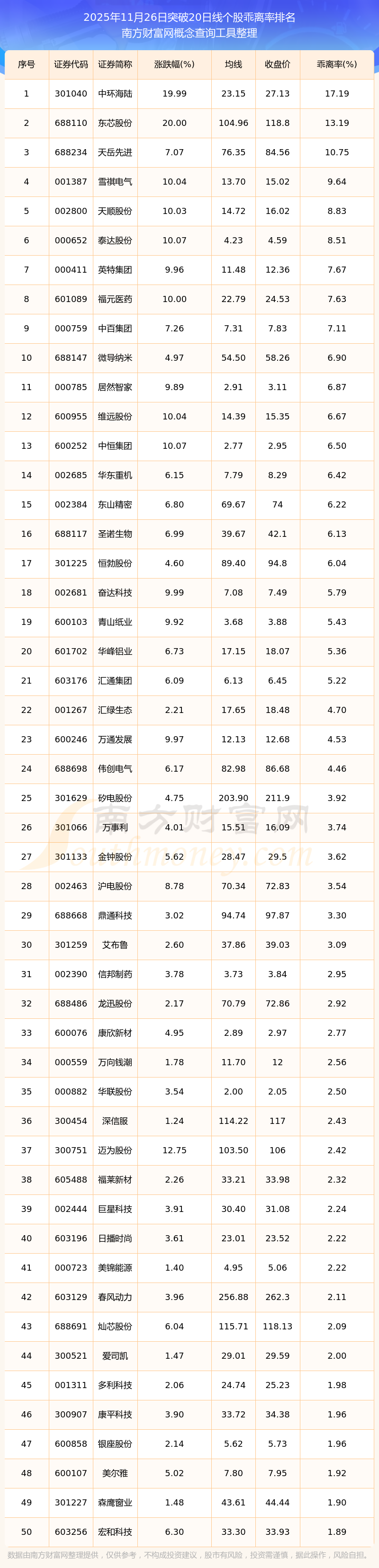 2025年11月26日突破20日線個(gè)股乖離率排名