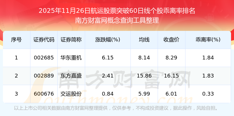 根據(jù)南方財富網(wǎng)概念查詢工具數(shù)據(jù)統(tǒng)計,截止2025年11月26日收盤,航運(yùn)股票共有3只個股收盤價向上突破了60日線。其中乖離率較大的個股有華東重機(jī)、東方嘉盛、交運(yùn)股份等,乖離率分別為1.84%、1.83%、0.33%。
