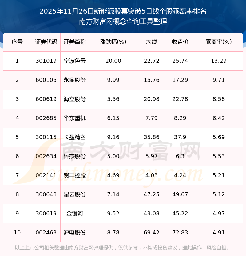 根據(jù)南方財富網概念查詢工具數(shù)據(jù)統(tǒng)計,截止2025年11月26日收盤,新能源股票共有33只個股收盤價向上突破了5日線。其中乖離率較大的個股有寧波色母、永鼎股份、海立股份等,乖離率分別為13.29%、9.71%、8.58%。