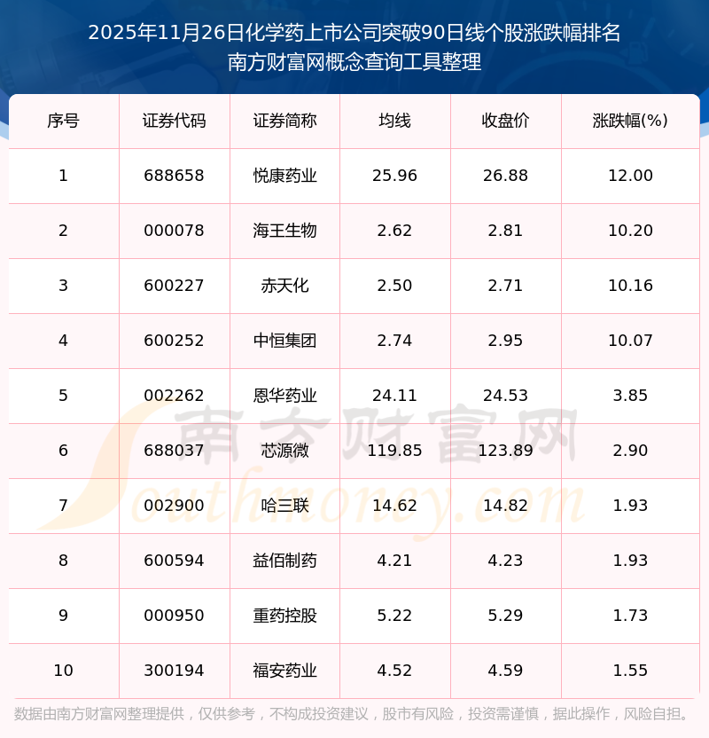 2025年11月26日化學藥上市公司突破90日線個股漲跌幅排名