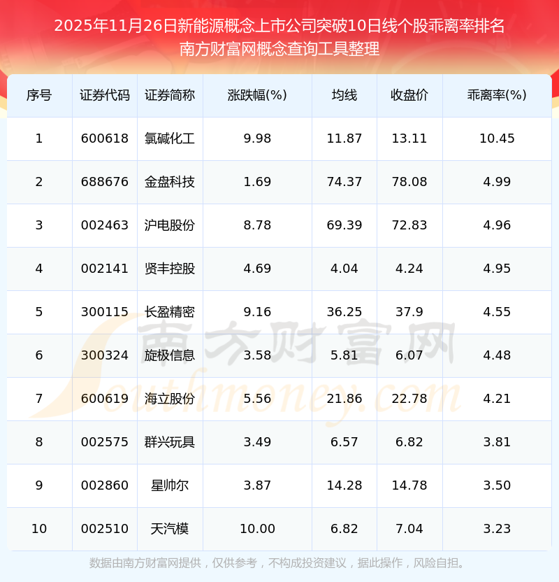 根據(jù)南方財(cái)富網(wǎng)概念查詢工具數(shù)據(jù)統(tǒng)計(jì),截止2025年11月26日收盤,新能源概念上市公司共有25只個(gè)股收盤價(jià)向上突破了10日線。其中乖離率較大的個(gè)股有氯堿化工、金盤科技、滬電股份等,乖離率分別為10.45%、4.99%、4.96%。
