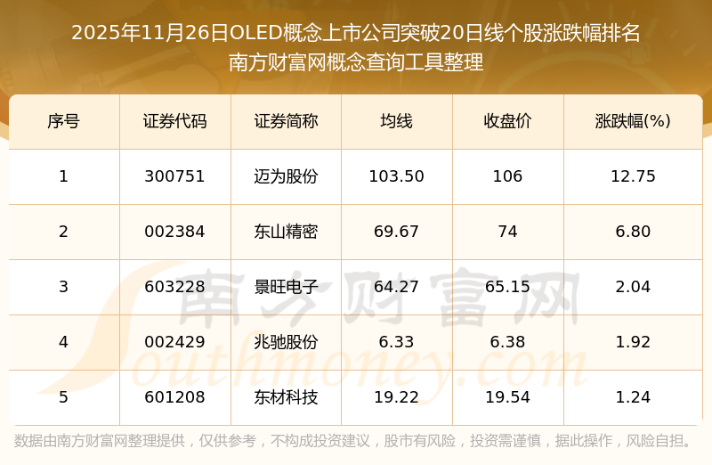2025年11月26日OLED概念上市公司突破20日線(xiàn)個(gè)股漲跌幅排名