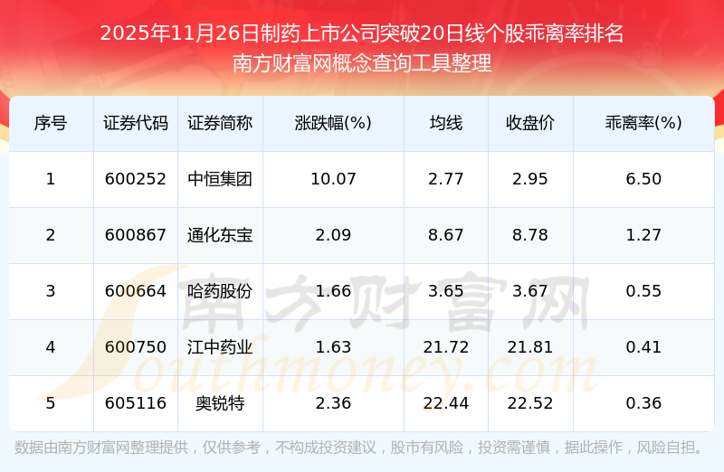 2025年11月26日制藥上市公司突破20日線個(gè)股乖離率排名