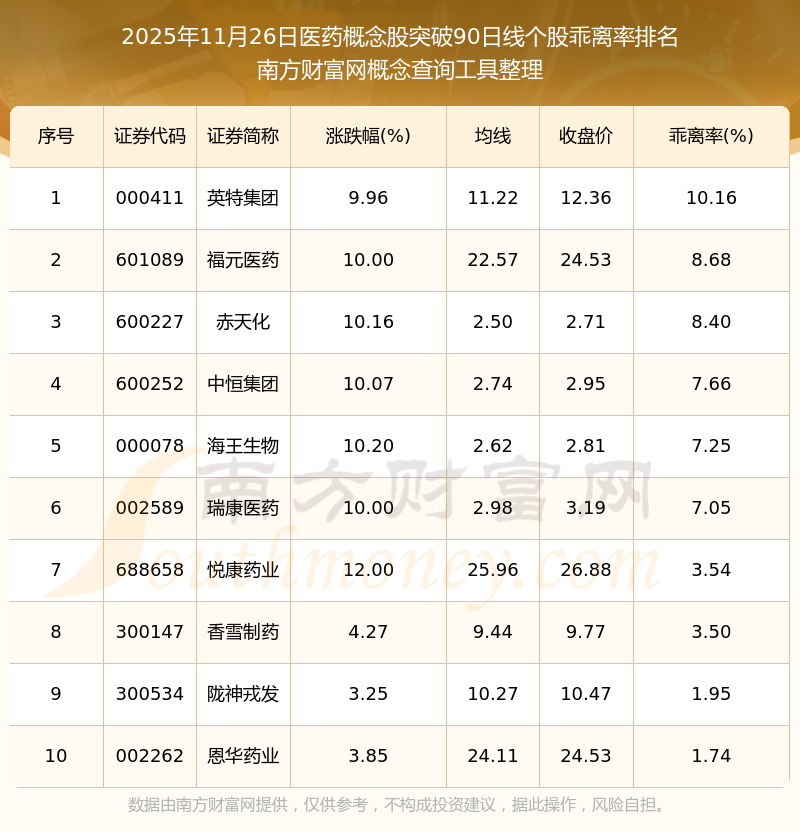 根據(jù)南方財(cái)富網(wǎng)概念查詢工具數(shù)據(jù)統(tǒng)計(jì),截止2025年11月26日收盤,醫(yī)藥概念股共有18只個(gè)股收盤價(jià)向上突破了90日線。其中乖離率較大的個(gè)股有英特集團(tuán)、福元醫(yī)藥、赤天化等,乖離率分別為10.16%、8.68%、8.40%。