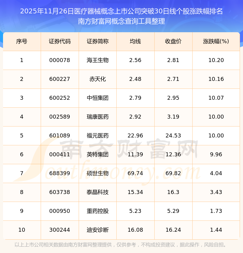 根據(jù)南方財(cái)富網(wǎng)概念查詢工具數(shù)據(jù)統(tǒng)計(jì),截止2025年11月26日收盤,醫(yī)療器械概念上市公司共有16只個(gè)股收盤價(jià)向上突破了30日線。其中漲幅較大的個(gè)股有海王生物、赤天化、中恒集團(tuán)等,漲幅分別為10.20%、10.16%、10.07%。