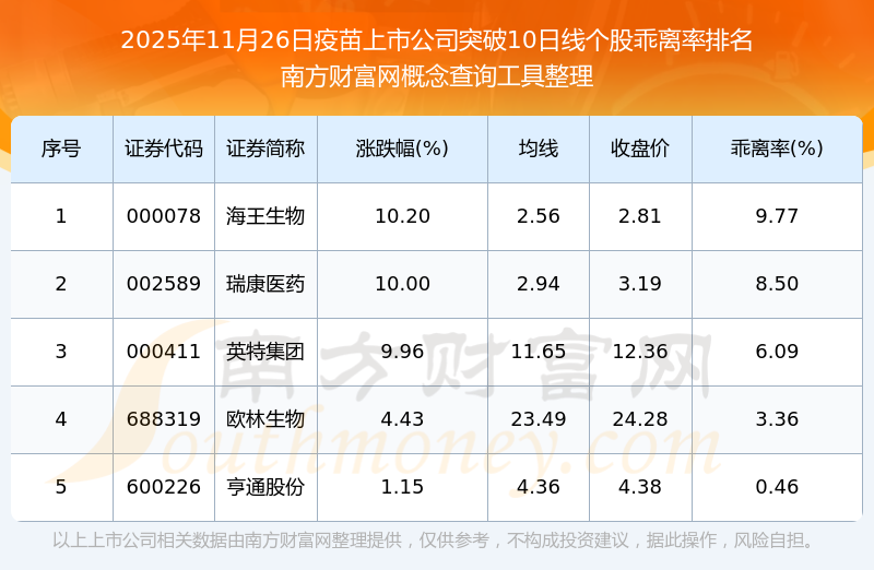 根據南方財富網概念查詢工具數據統(tǒng)計,截止2025年11月26日收盤,疫苗上市公司共有5只個股收盤價向上突破了10日線。其中乖離率較大的個股有海王生物、瑞康醫(yī)藥、英特集團等,乖離率分別為9.77%、8.50%、6.09%。