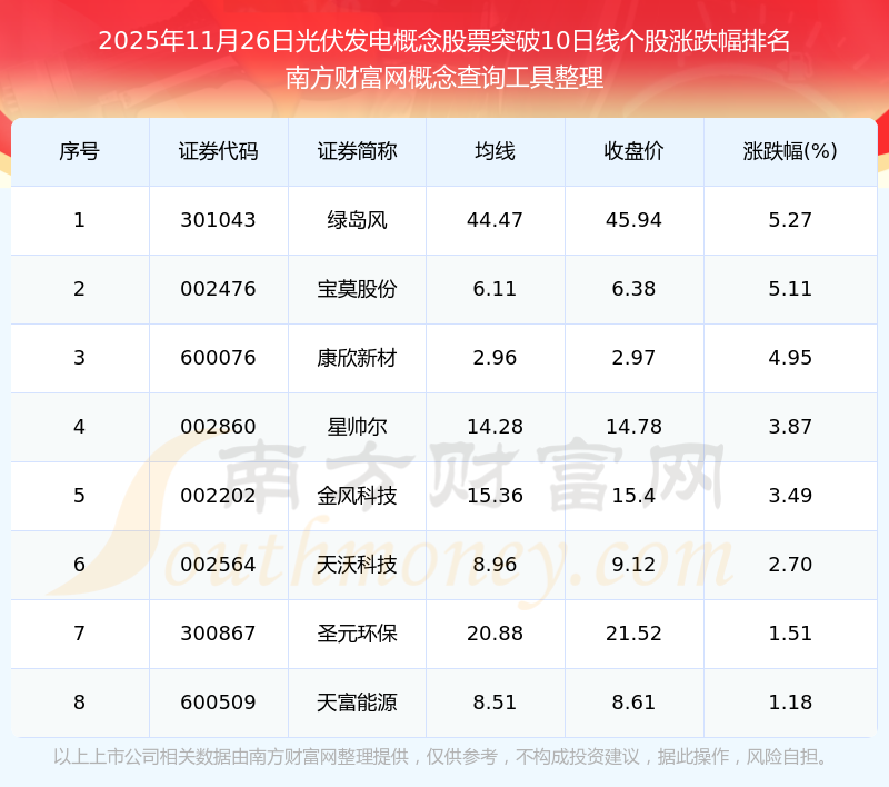 2025年11月26日光伏發(fā)電概念股票突破10日線個股漲跌幅排名
