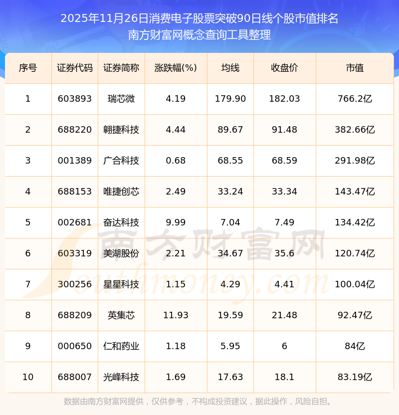 根據(jù)南方財(cái)富網(wǎng)概念查詢工具數(shù)據(jù)統(tǒng)計(jì),截止2025年11月26日收盤,消費(fèi)電子股票共有17只個(gè)股收盤價(jià)向上突破了90日線。其中市值較大的個(gè)股有瑞芯微、翱捷科技、廣合科技等,市值分別為766.2億、382.66億、291.98億。