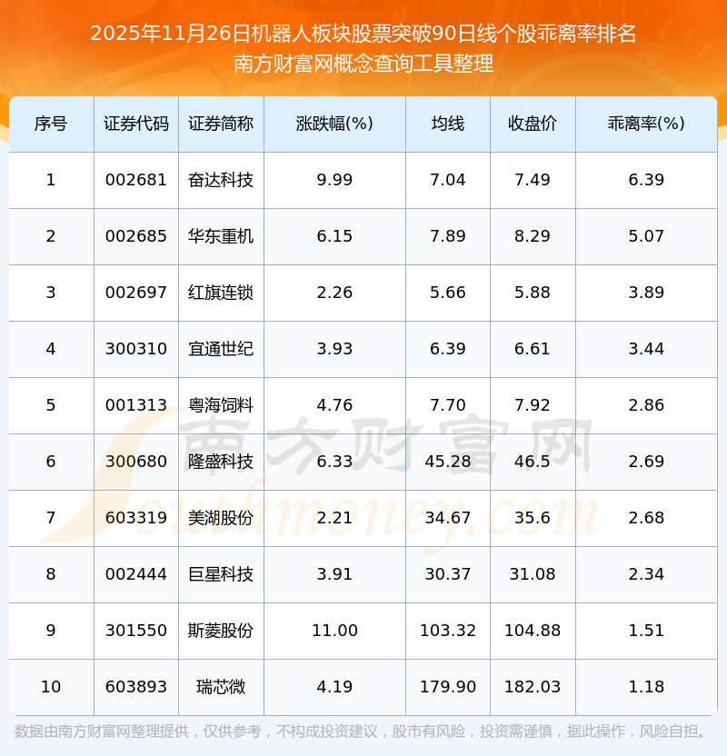 根據(jù)南方財富網(wǎng)概念查詢工具數(shù)據(jù)統(tǒng)計,截止2025年11月26日收盤,機器人板塊股票共有16只個股收盤價向上突破了90日線。其中乖離率較大的個股有奮達科技、華東重機、紅旗連鎖等,乖離率分別為6.39%、5.07%、3.89%。