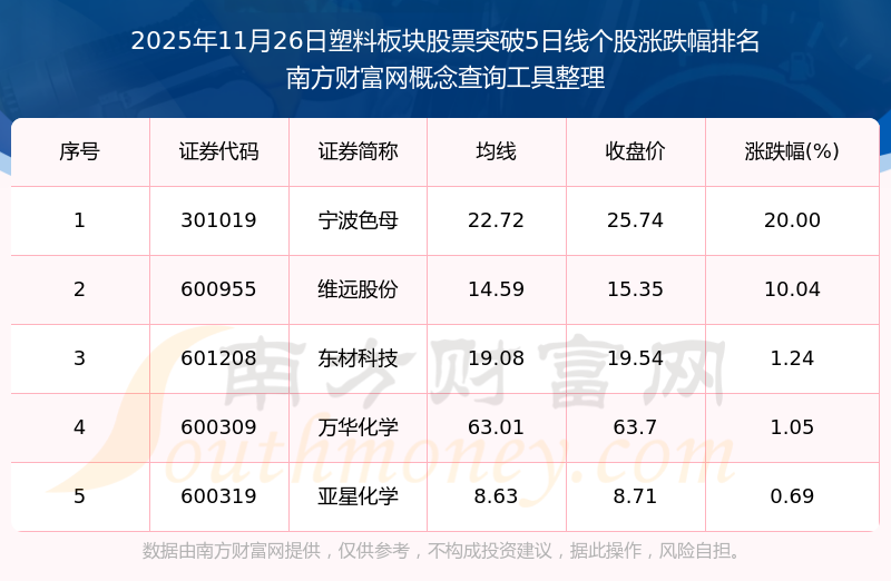 2025年11月26日塑料板塊股票突破5日線個股漲跌幅排名
