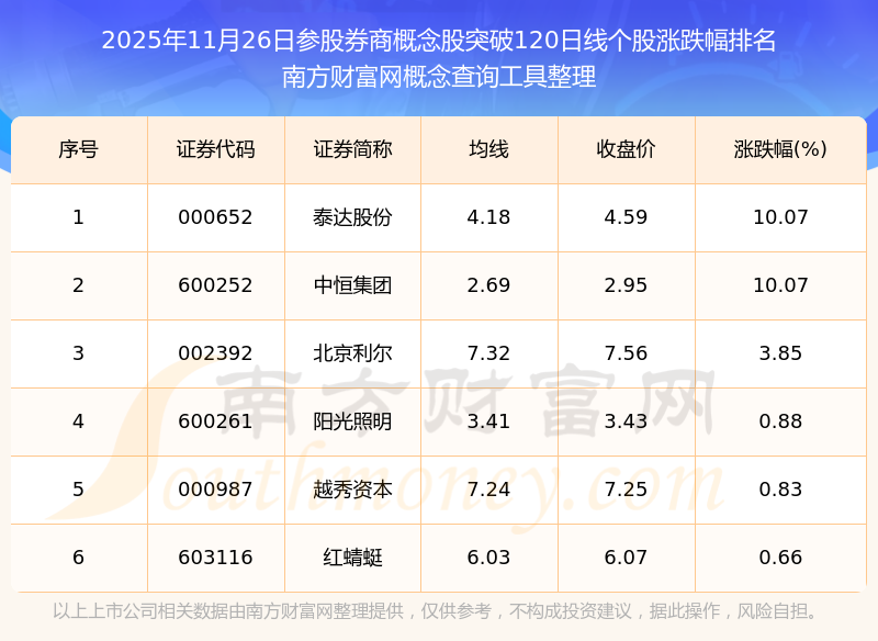 根據南方財富網概念查詢工具數據統(tǒng)計,截止2025年11月26日收盤,參股券商概念股共有6只個股收盤價向上突破了120日線。其中漲幅較大的個股有中恒集團、泰達股份、北京利爾等,漲幅分別為10.07%、10.07%、3.85%。