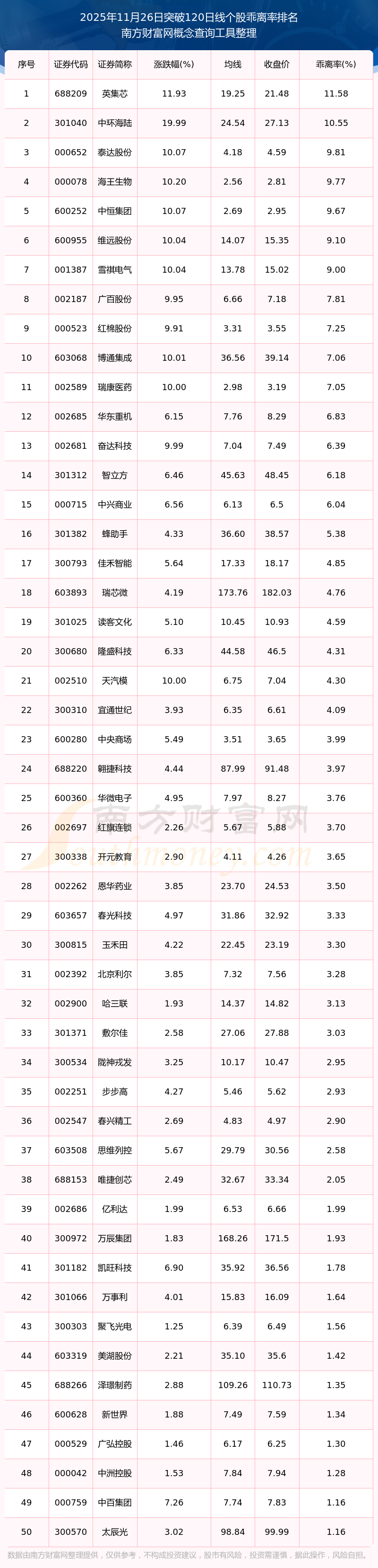 根據(jù)南方財(cái)富網(wǎng)概念查詢工具數(shù)據(jù)統(tǒng)計(jì),截止2025年11月26日收盤,共有88只個股收盤價向上突破了半年線,其中乖離率較大的個股有英集芯、中環(huán)海陸、泰達(dá)股份、海王生物、中恒集團(tuán)等,乖離率分別為11.58%、10.55%、9.81%、9.77%、9.67%。