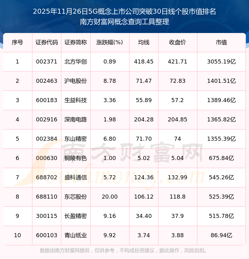 2025年11月26日5G概念上市公司突破30日線個股市值排名