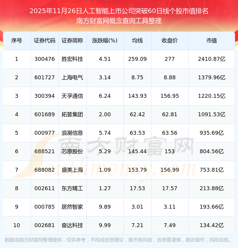 2025年11月26日人工智能上市公司突破60日線個股市值排名