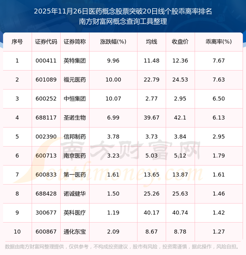 2025年11月26日醫(yī)藥概念股票突破20日線個股乖離率排名