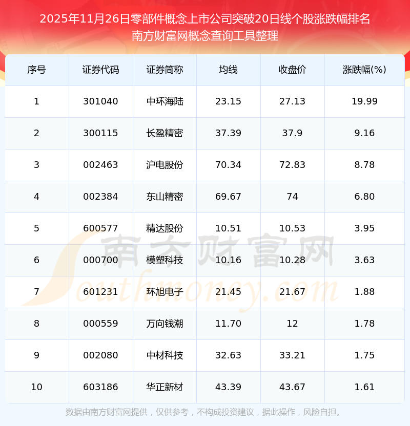 根據(jù)南方財(cái)富網(wǎng)概念查詢工具數(shù)據(jù)統(tǒng)計(jì),截止2025年11月26日收盤,零部件概念上市公司共有12只個(gè)股收盤價(jià)向上突破了20日線。其中漲幅較大的個(gè)股有中環(huán)海陸、長(zhǎng)盈精密、滬電股份等,漲幅分別為19.99%、9.16%、8.78%。