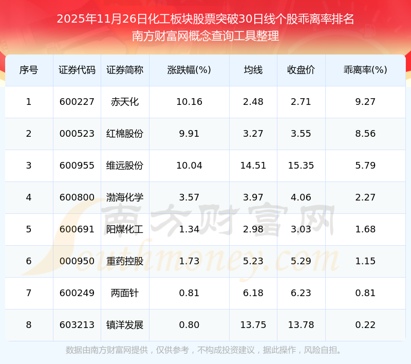根據(jù)南方財富網(wǎng)概念查詢工具數(shù)據(jù)統(tǒng)計,截止2025年11月26日收盤,化工板塊股票共有8只個股收盤價向上突破了30日線。其中乖離率較大的個股有赤天化、紅棉股份、維遠(yuǎn)股份等,乖離率分別為9.27%、8.56%、5.79%。