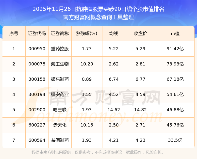 根據(jù)南方財(cái)富網(wǎng)概念查詢工具數(shù)據(jù)統(tǒng)計(jì),截止2025年11月26日收盤,抗腫瘤股票共有7只個(gè)股收盤價(jià)向上突破了90日線。其中市值較大的個(gè)股有重藥控股、海王生物、振東制藥等,市值分別為91.42億、73.93億、67.18億。