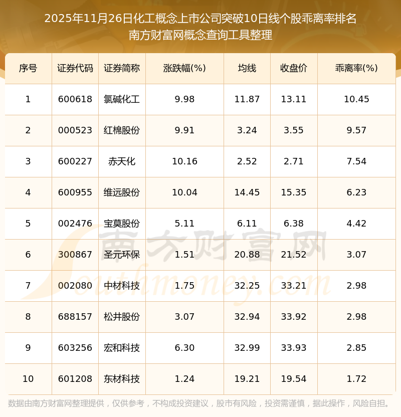2025年11月26日化工概念上市公司突破10日線個(gè)股乖離率排名