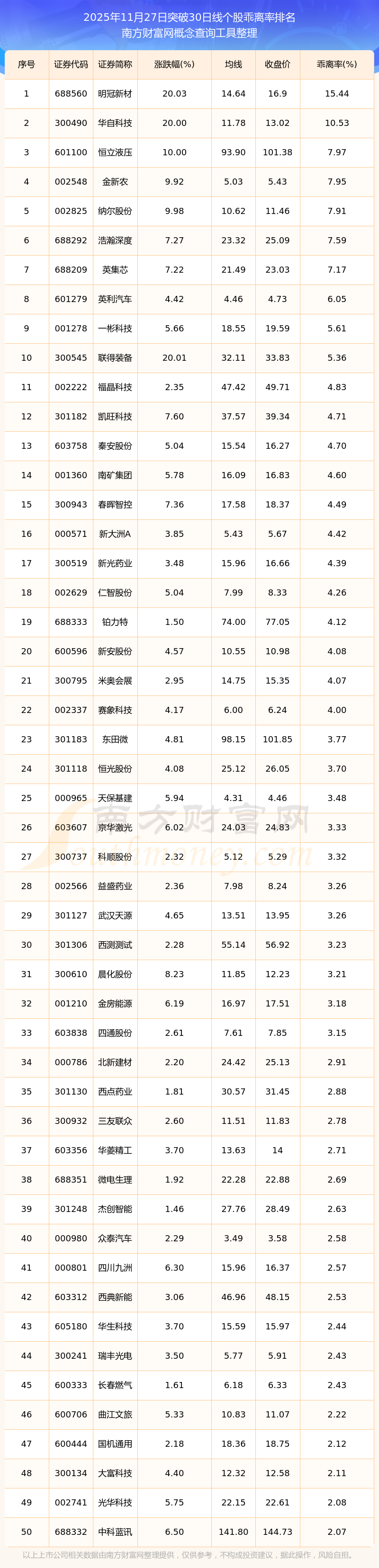 2025年11月27日突破30日線個(gè)股乖離率排名