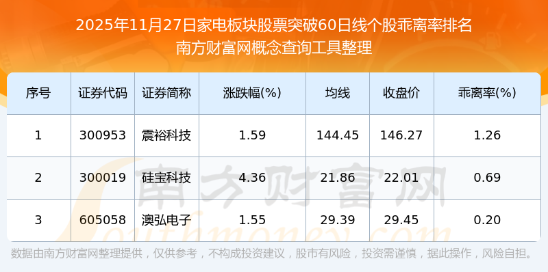 2025年11月27日家電板塊股票突破60日線個(gè)股乖離率排名