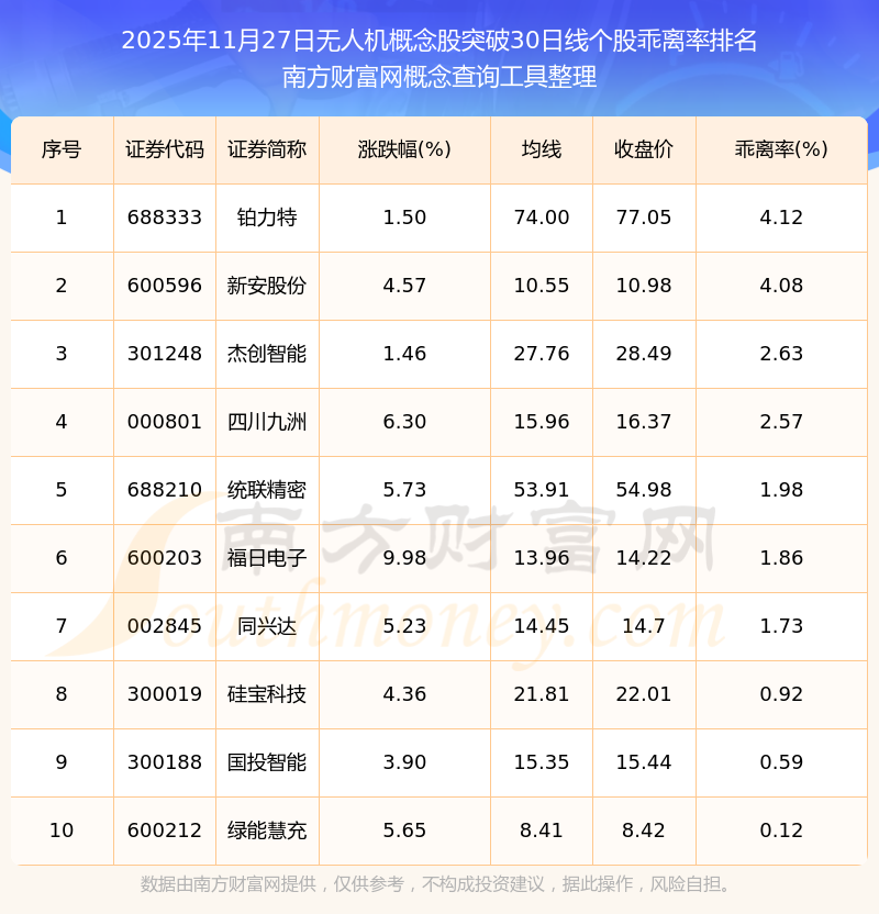 根據南方財富網概念查詢工具數據統(tǒng)計,截止2025年11月27日收盤,無人機概念股共有10只個股收盤價向上突破了30日線。其中乖離率較大的個股有鉑力特、新安股份、杰創(chuàng)智能等,乖離率分別為4.12%、4.08%、2.63%。