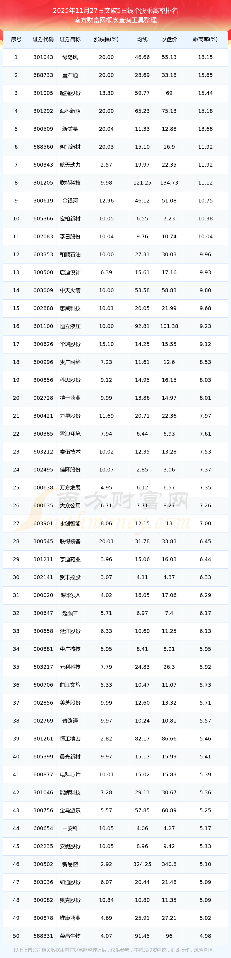 根據(jù)南方財富網(wǎng)概念查詢工具數(shù)據(jù)統(tǒng)計,截止2025年11月27日收盤,共有291只個股收盤價向上突破了5日線,其中乖離率較大的個股有綠島風(fēng)、壹石通、超捷股份、?菩略础⑿旅佬堑,乖離率分別為18.15%、15.65%、15.44%、15.18%、13.68%。