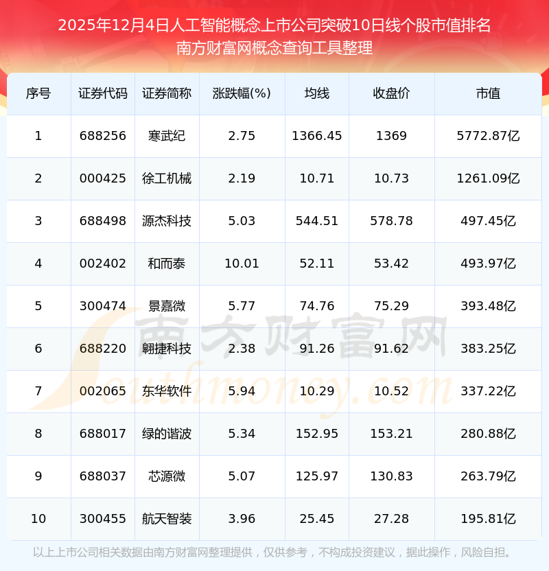 2025年12月4日人工智能概念上市公司突破10日線個股市值排名