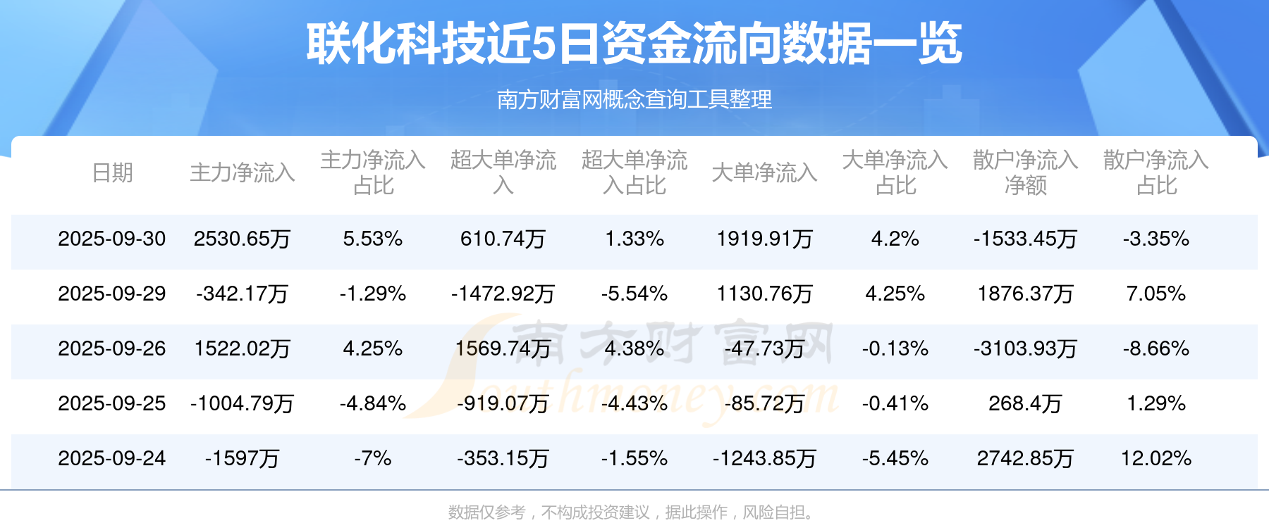 9月30日消息,聯(lián)化科技主力凈流入2530.65萬(wàn)元,超大單凈流入610.74萬(wàn)元,散戶凈流出1533.45萬(wàn)元。