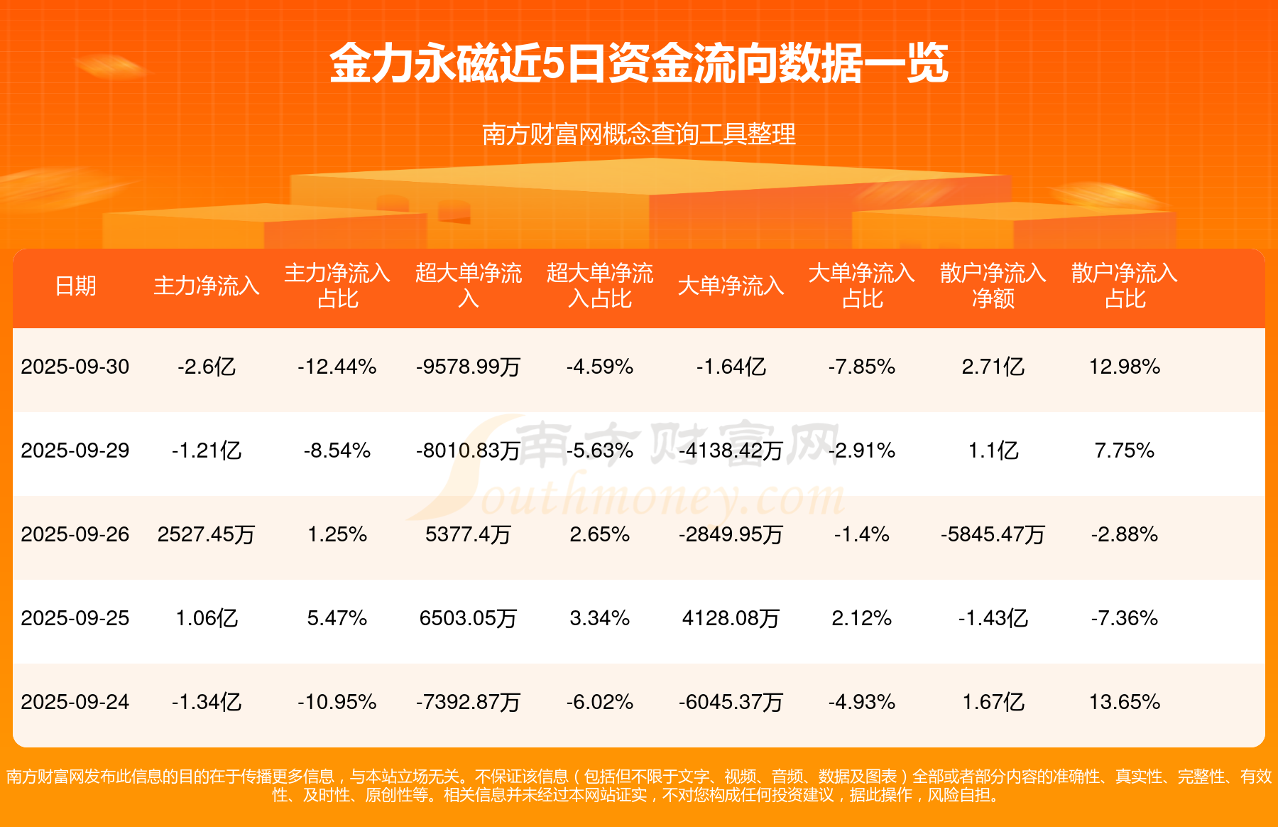 9月30日消息,金力永磁9月30日主力資金凈流出2.6億元,超大單資金凈流出9578.99萬(wàn)元,大單資金凈流出1.64億元,散戶資金凈流入2.71億元。