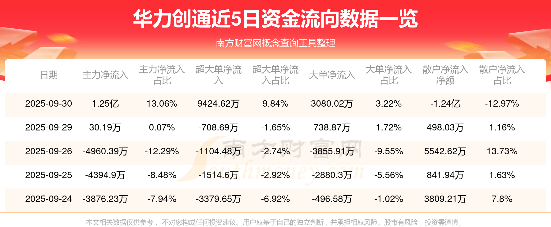 9月30日消息,華力創(chuàng)通主力資金凈流入1.25億元,超大單資金凈流入9424.62萬元,散戶資金凈流出1.24億元。