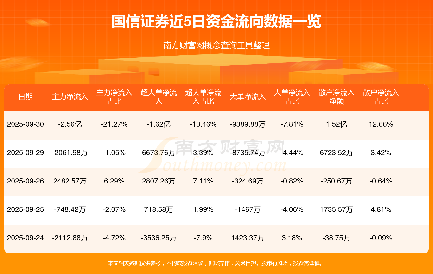 9月30日消息,國信證券9月30日主力資金凈流出2.56億元,超大單資金凈流出1.62億元,大單資金凈流出9389.88萬元,散戶資金凈流入1.52億元。