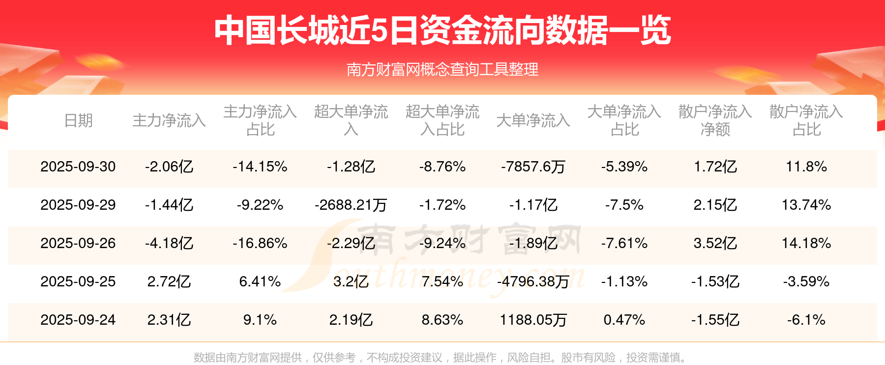 9月30日消息,中國長城9月30日主力資金凈流出2.06億元,超大單資金凈流出1.28億元,大單資金凈流出7857.6萬元,散戶資金凈流入1.72億元。