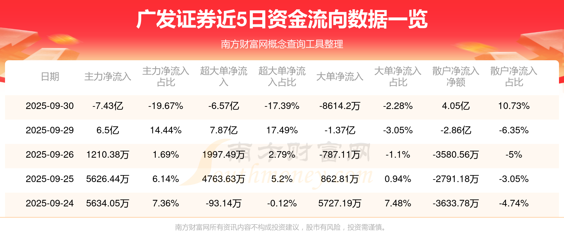 9月30日消息,廣發(fā)證券主力資金凈流出7.43億元,超大單資金凈流出6.57億元,散戶資金凈流入4.05億元。