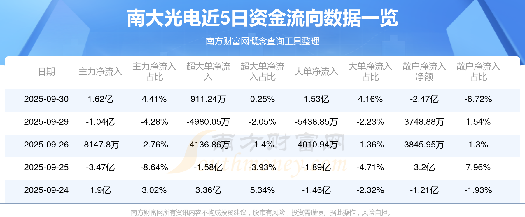 9月30日該股主力凈流入1.62億元,超大單凈流入911.24萬元,大單凈流入1.53億元,中單凈流入8506.91萬元,散戶凈流出2.47億元。