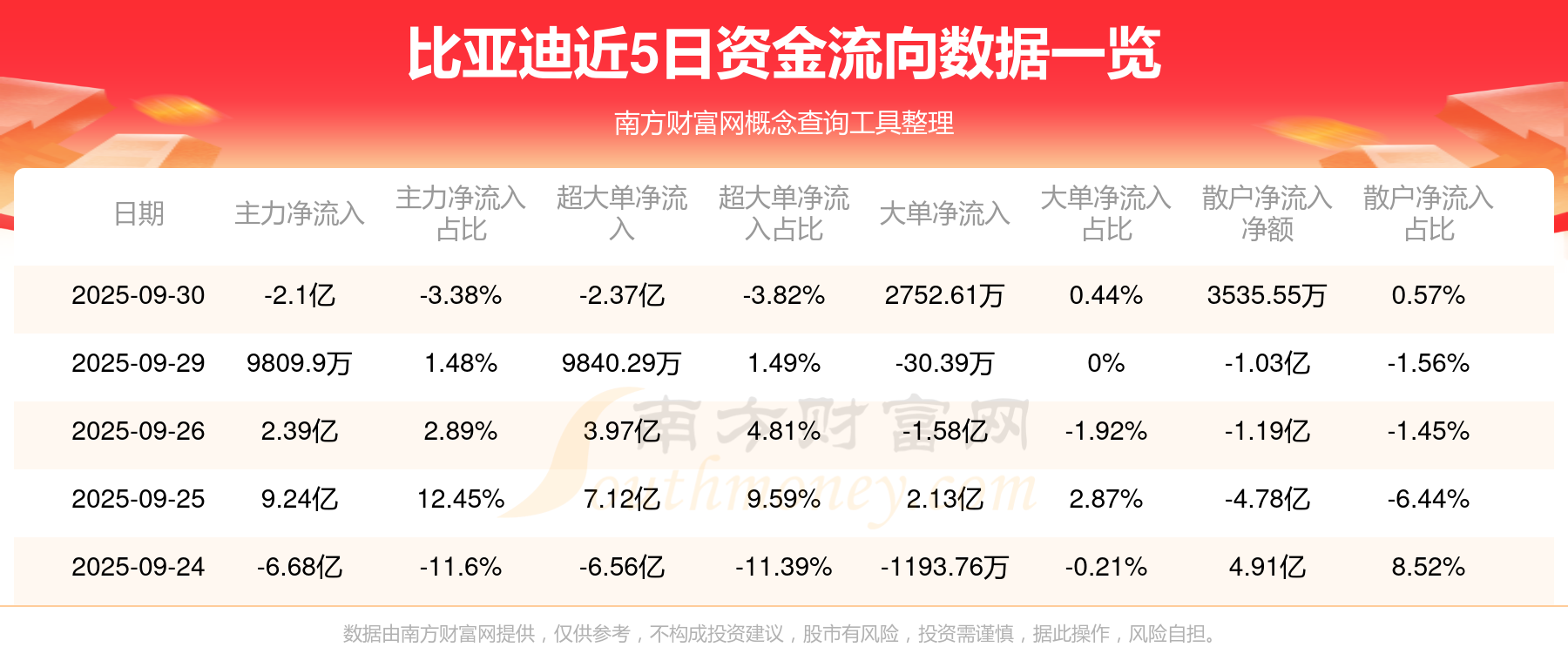 9月30日消息,比亞迪9月30日主力凈流出2.1億元,超大單凈流出2.37億元,大單凈流入2752.61萬元,散戶凈流入3535.55萬元。