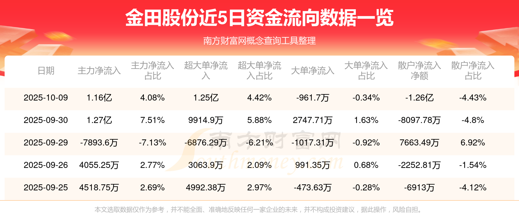 10月9日消息,金田股份主力凈流入1.16億元,超大單凈流入1.25億元,散戶凈流出1.26億元。