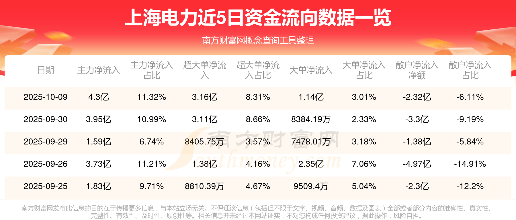 10月9日消息,上海電力10月9日主力凈流入4.3億元,超大單凈流入3.16億元,大單凈流入1.14億元,散戶凈流出2.32億元。