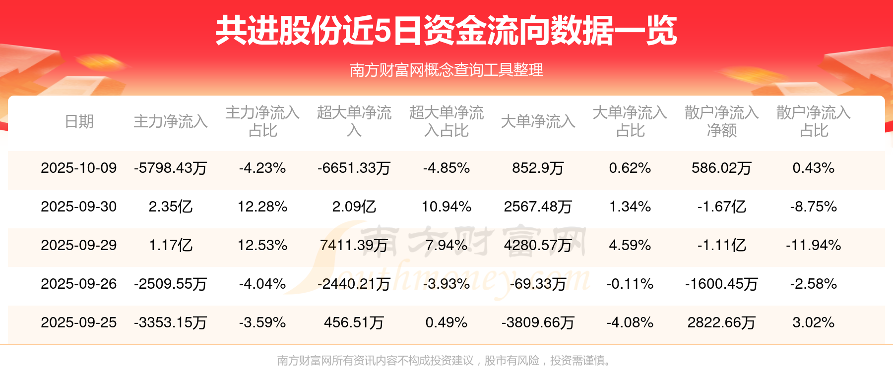 10月9日消息,共進股份10月9日主力資金凈流出5798.43萬元,超大單資金凈流出6651.33萬元,大單資金凈流入852.9萬元,散戶資金凈流入586.02萬元。