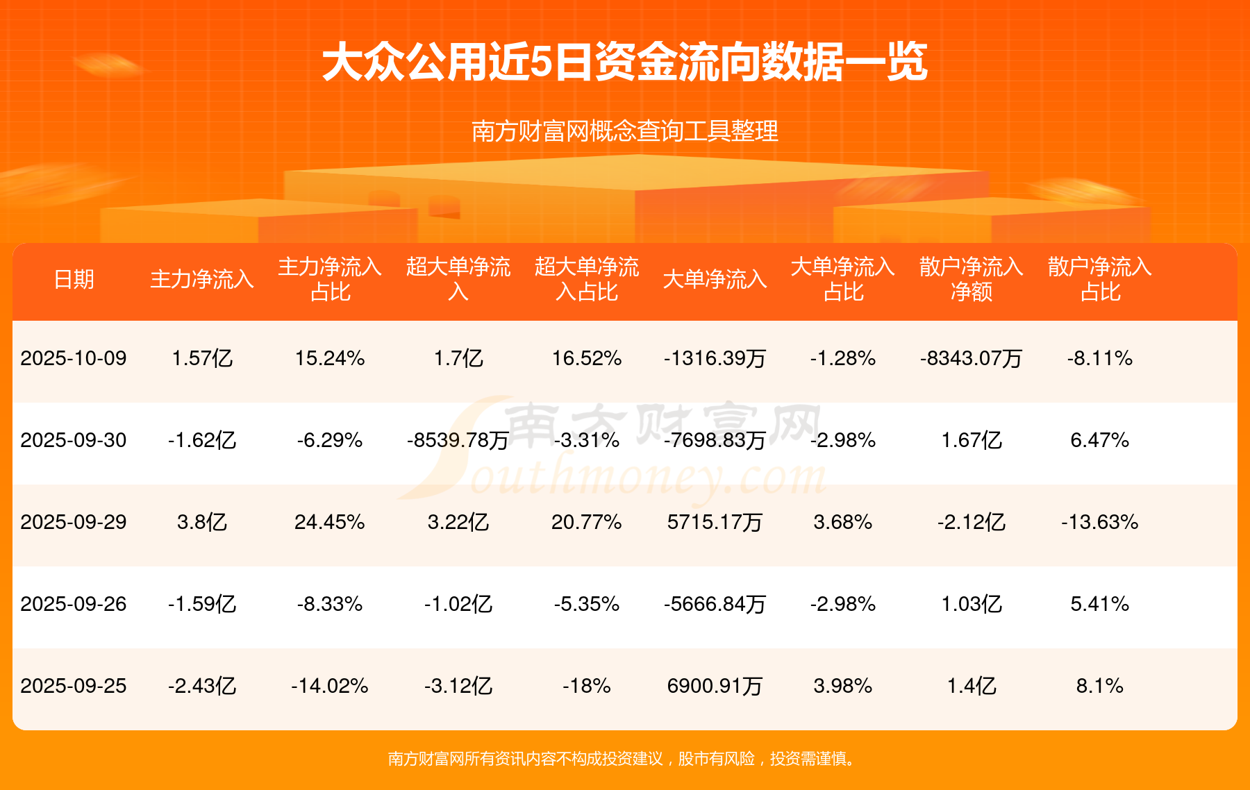 資金流向數(shù)據(jù)方面,10月9日主力資金凈流流入1.57億元,超大單資金凈流入1.7億元,大單資金凈流出1316.39萬(wàn)元,散戶資金凈流出8343.07萬(wàn)元。