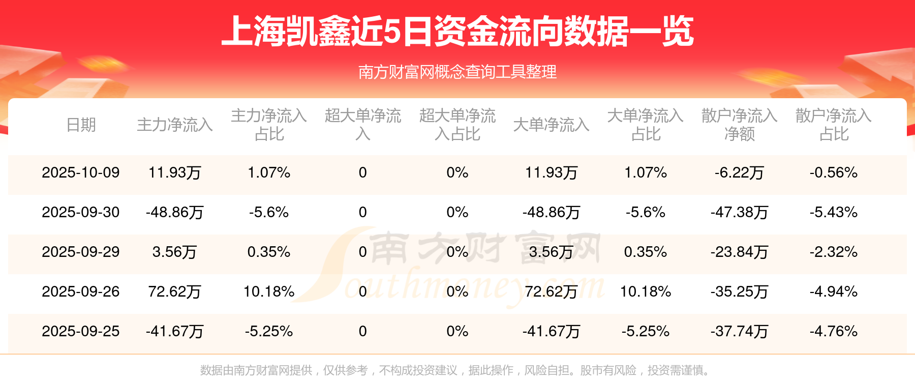 10月9日消息,ST凱鑫10月9日主力凈流入11.93萬元,大單凈流入11.93萬元,散戶凈流出6.22萬元。
