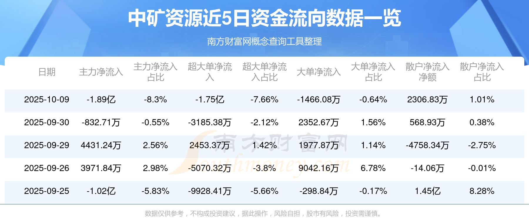 10月9日消息,中礦資源10月9日主力資金凈流出1.89億元,超大單資金凈流出1.75億元,大單資金凈流出1466.08萬元,散戶資金凈流入2306.83萬元。