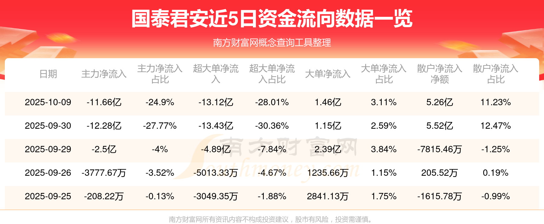 10月9日消息,國泰君安10月9日主力資金凈流出11.66億元,超大單資金凈流出13.12億元,大單資金凈流入1.46億元,散戶資金凈流入5.26億元。